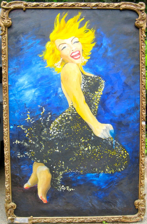 The painter may have sought to improve upon the representation by reversing and intensely colorizing the image. While the repositioning of her feet does not take away from her joyous abandon, it helps portray Miss Monroe as a diminutive yet zaftig ballerina en pointe in mid-pirouette.”